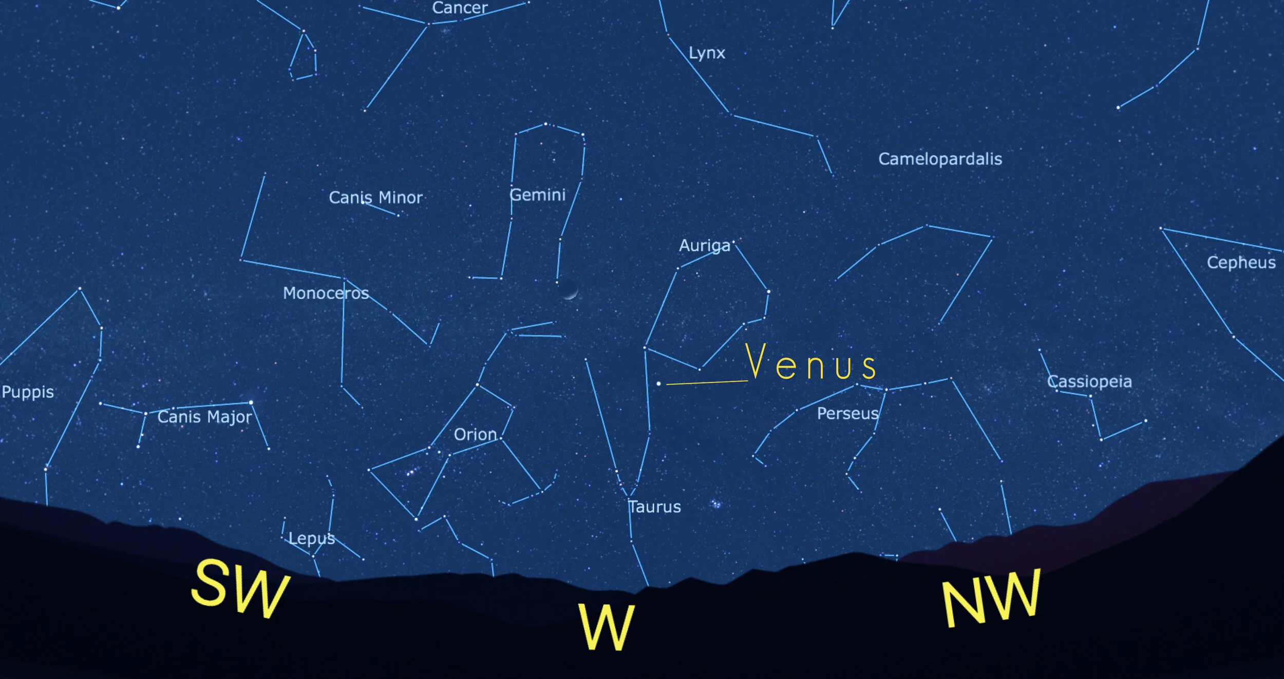 While it’s sometimes visible during the day, the easiest way to spot it is to go out at sunset and face due West and scan for the first object you see. Venus is the first object visible in the twilight and many observers find it successfully within minutes of the sunset. If you don’t see it immediately, don’t worry, after twilight it’s far and away the brightest object in the night sky, so bright in fact it’s often confused for aircraft.